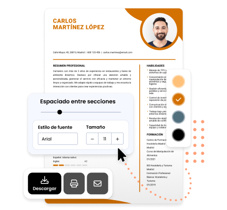Desde el primer clic que hagas hasta la descarga final, nuestro editor de CV online te guía en cada una de las secciones. Sigue las indicaciones personalizadas y sugerencias de contenido para redactar con seguridad, incluso si es tu primer currículum.